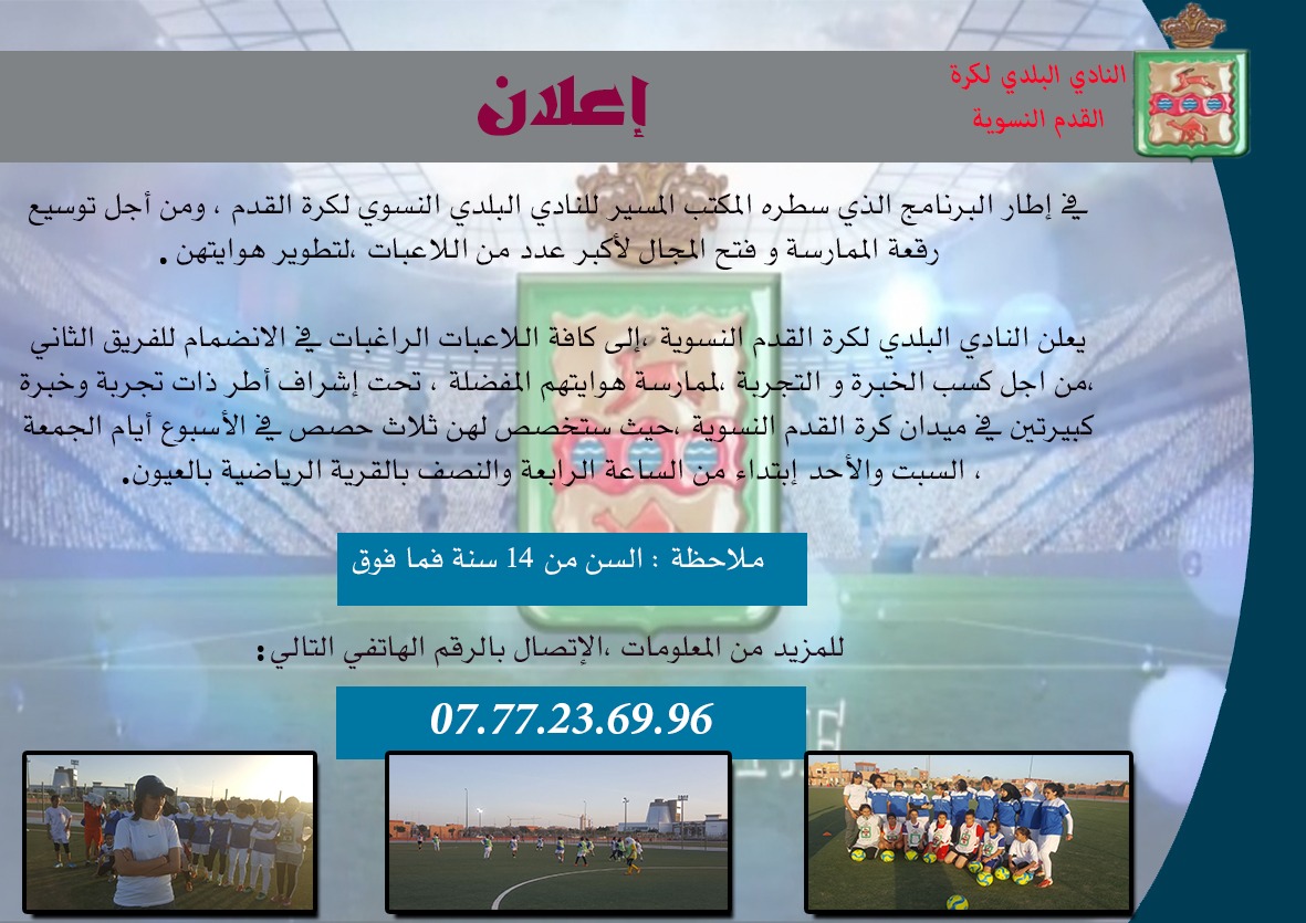 يعلن النادي البلدي لكرة القدم النسوية ،إلى كافة اللاعبات الراغبات في الانضمام للفريق الثاني ،من اجل كسب الخبرة و التجربة ،لممارسة هوايتهم المفضلة ، تحت إشراف أطر ذات تجربة وخبرة كبيرتين في ميدان كرة القدم النسوية ،حيث ستخصص لهن ثلاث حصص في الأسبوع أيام الجمعة ، السبت والأحد إبتداء من الساعة الرابعة والنصف بالقرية الرياضية بالعيون .