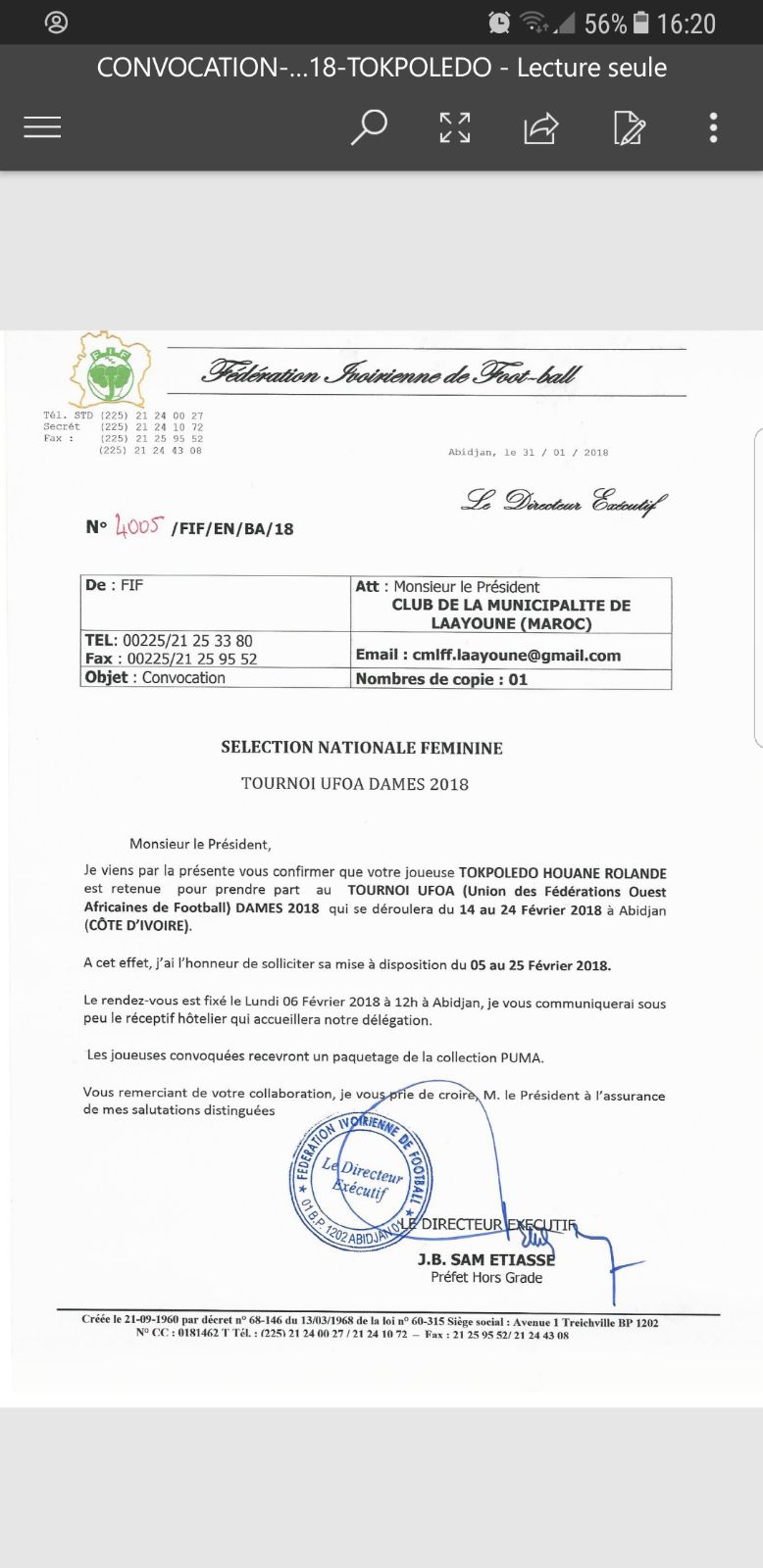 ويأتي غياب اللاعبة بسبب إلتزامها مع منتخب كوت ديفوار ،الذي وجه الدعوة للاعبة للمشاركة في دوري إتحادات غرب إفريقيا لكرة القدم النسوية ،خلال الفترة من 05 إلى 25 فبراير الجاري بالعاصمة الإيفوارية أبيدجان إستعدادا للإقصائيات المؤهلة .