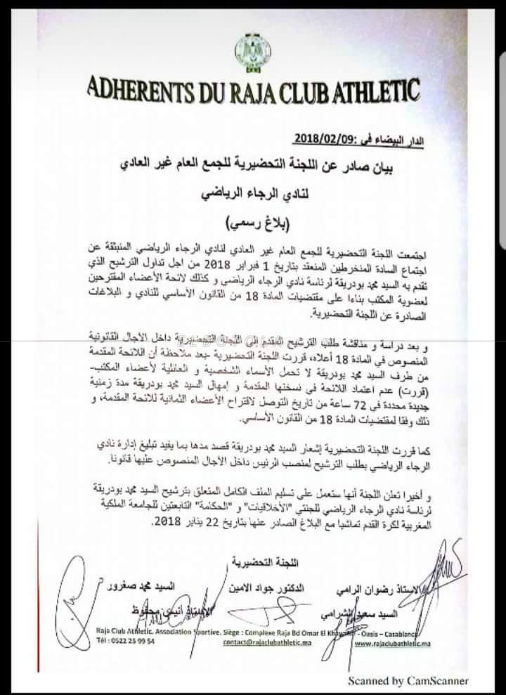 قررت اللجنة التحضيرية للجمع العام غير العادي لنادي الرجاء الرياضي، في بلاغ صادر عنها، و التي حصلت “البطولة” على نسخة منه، عدم اعتماد اللائحة المقدمة من طرف السيد محمد بودريقة، و ذلك بعد مناقشة و دراسة لملف طلب ترشيح هذا الأخير، لعدم توفر اللائحة على الأسماء الشخصية و العائلية لأعضاء المكتب.