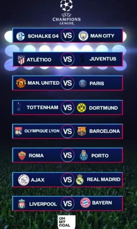 وأوقعت القرعة ريال مدريد في مواجهة أياكس بينما يلاقي برشلونة فريق ليون .. ويواجه مانشستر يونايتد غريمه سان جيرمان ويلاقي مانشستر سيتي فريق شالكه ،ويصطدم بوروسيا دورتموند مع توتنهام أما اللقاء الاخير فيجمع روما وبورتو.