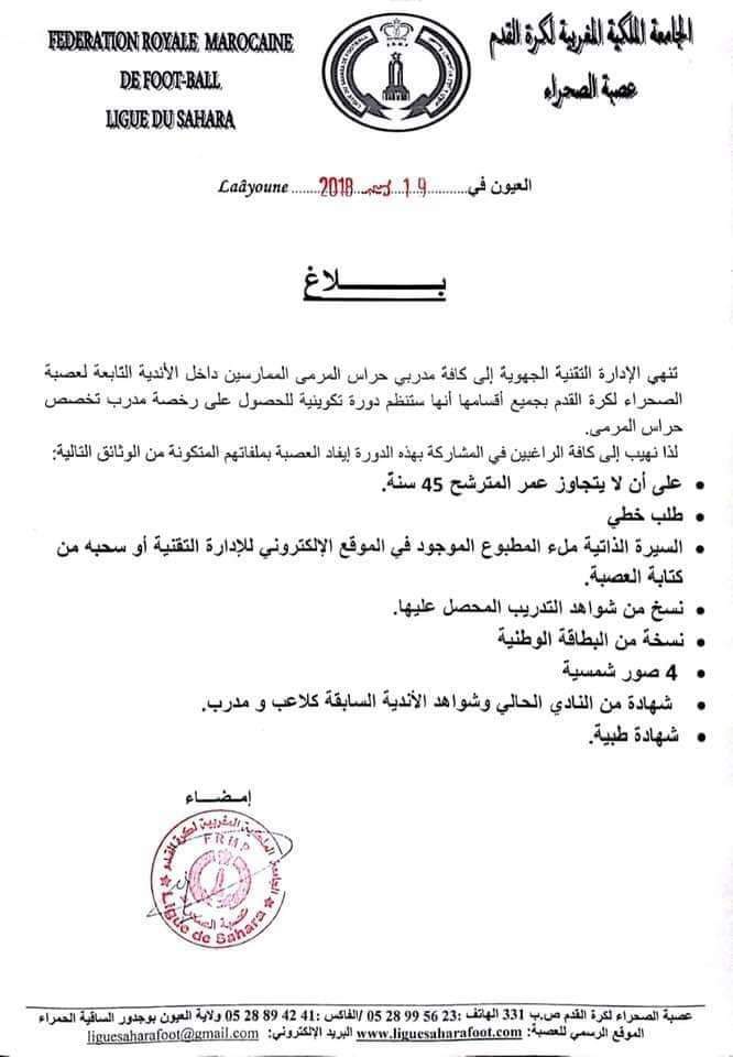 توصل الموقع الإخباري ” جديد الصحراء الرياضي” ببلاغ تنهي من خلاله الإدارة التقنية الجهوية إلى كافة مدربي حراس المرمى الممارسين داخل الأندية التابعة لعصبة الصحراء لكرة القدم ، بجميع أقسامها أنها ستنظم دورة تكوينية للحصول على رخصة مدرب تخصص حراس المرمى .