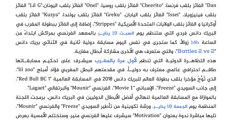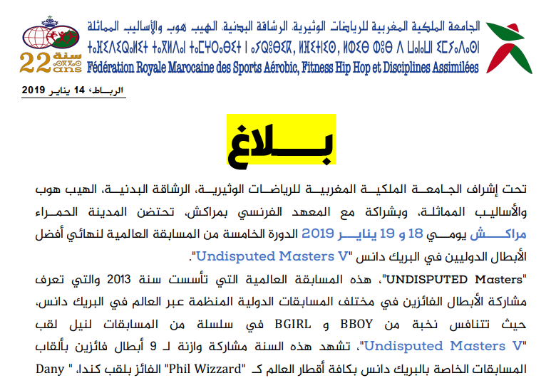 مدينة مراكش تحتضن فعاليات الدورة الخامسة للنهائي العالمي في البريك دانسرياضة إدارة الموقع نشر في 15 يناير 2019 الساعة 4 و 59 دقيقة جديد الصحراء الرياضي : بلاغ مشاركة بفايسبوكFacebookFacebookمشاركة بتويترTwitterTwitter مشاركة بواتسابWhatsAppWhatsApp Share to ارسال ايميلEmailEmail مشاركة بلينكدانLinkedInLinkedInمشاركة بمسنجرMessengerMessenger طباعةPrintطباعة رابط المشاركة :