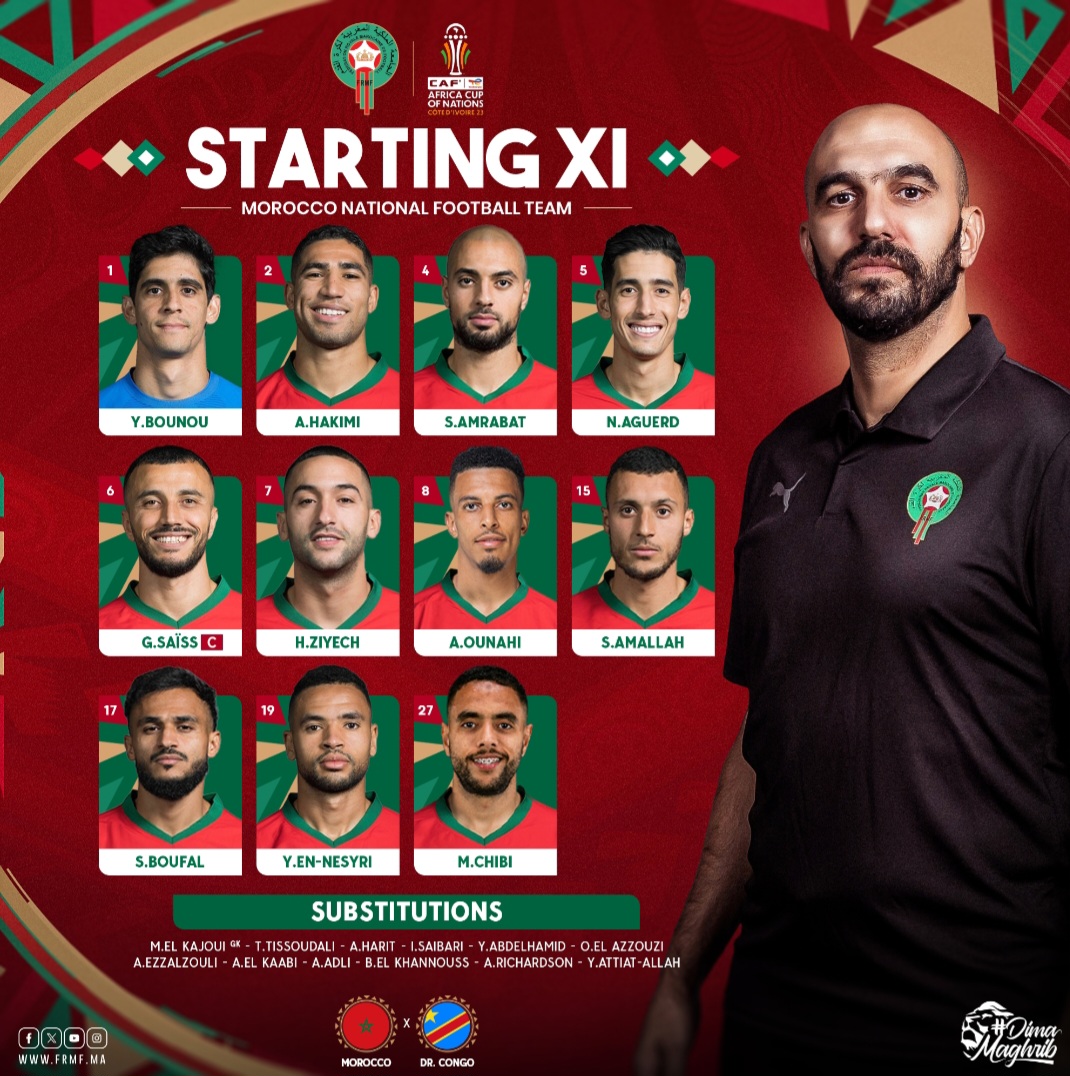 أعلن السيد ” وليد الركراكي” مدرب المنتخب الوطني لكرة القدم عن التشكيلة الرسمية لأسود الأطلس التي ستواجه منتخب الكونغو الديمقراطية بعد ساعة من الأن على أرضية ملعب لوران بوكو بمدينة سان بيدرو.