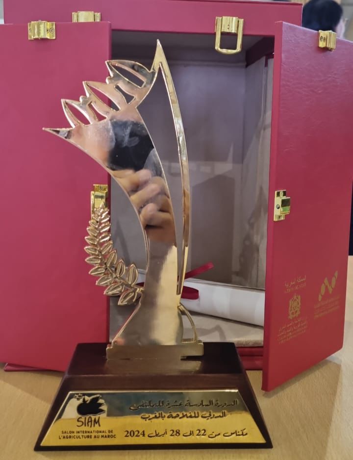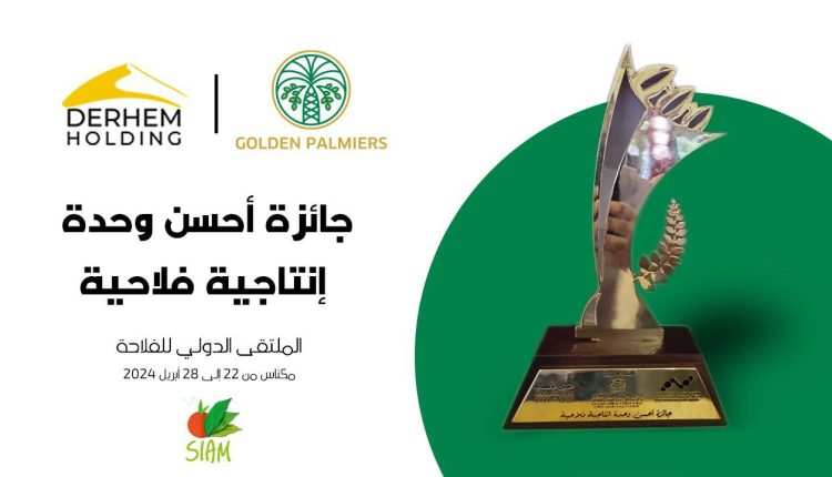 تمكنت شركة Golden Palmiers التابعة ل DERHEM Holding من الحصول على جائزة الإستحقاق كأحسن وحدة إنتاجية فلاحية في سلسلة التمّور ببلادنا، خلال الدورة السادسة عشرة للملتقى الدولي للفلاحة بمكناس، والمنظم في الفترة ما بين 22 أبريل 2024 إلى غاية 28 أبريل 2024، تحت شعار: “المناخ والفلاحة.. من أجل نظم إنتاج مستدامة وقادرة على الصمود”.