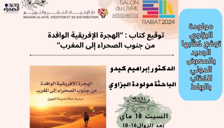 شهد معرض الرباط الدولي للكتاب، حفل توقيع كتاب “الهجرة الافريقية الوافدة من جنوب الصحراء إلى المغرب- دراسة حالة مدينة العيون”، للأستاذة الباحثة مولودة البزاوي الإطار التربوي بالأكاديمية الجهوية للتربية والتكوين العيون الساقية الحمراء وذلك بإشراف من الأستاذ الجامعي بجماعة ابن زهر باكادير
