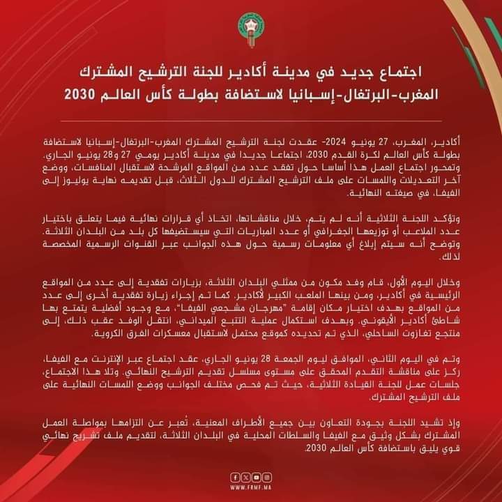 بلاغ إجتماع لجنة الترشيح المشترك المغرب-البرتغال-إسبانيا كأس العالم 2030رياضة إدارة الموقع نشر في 29 يونيو 2024 الساعة 14 و 04 دقيقة جديد الصحراء : بلاغ إجتماع لجنة الترشيح المشترك المغرب-البرتغال-إسبانيا كأس العالم 2030. مشاركة بفايسبوكFacebookFacebookمشاركة بتويترTwitterTwitter مشاركة بواتسابWhatsAppWhatsApp Share to ارسال ايميلEmailEmail مشاركة بلينكدانLinkedInLinkedInمشاركة بمسنجرMessengerMessenger طباعةPrintطباعة رابط المشاركة : الجامعة الملكية المغربية لكرة القدمكأس العالم