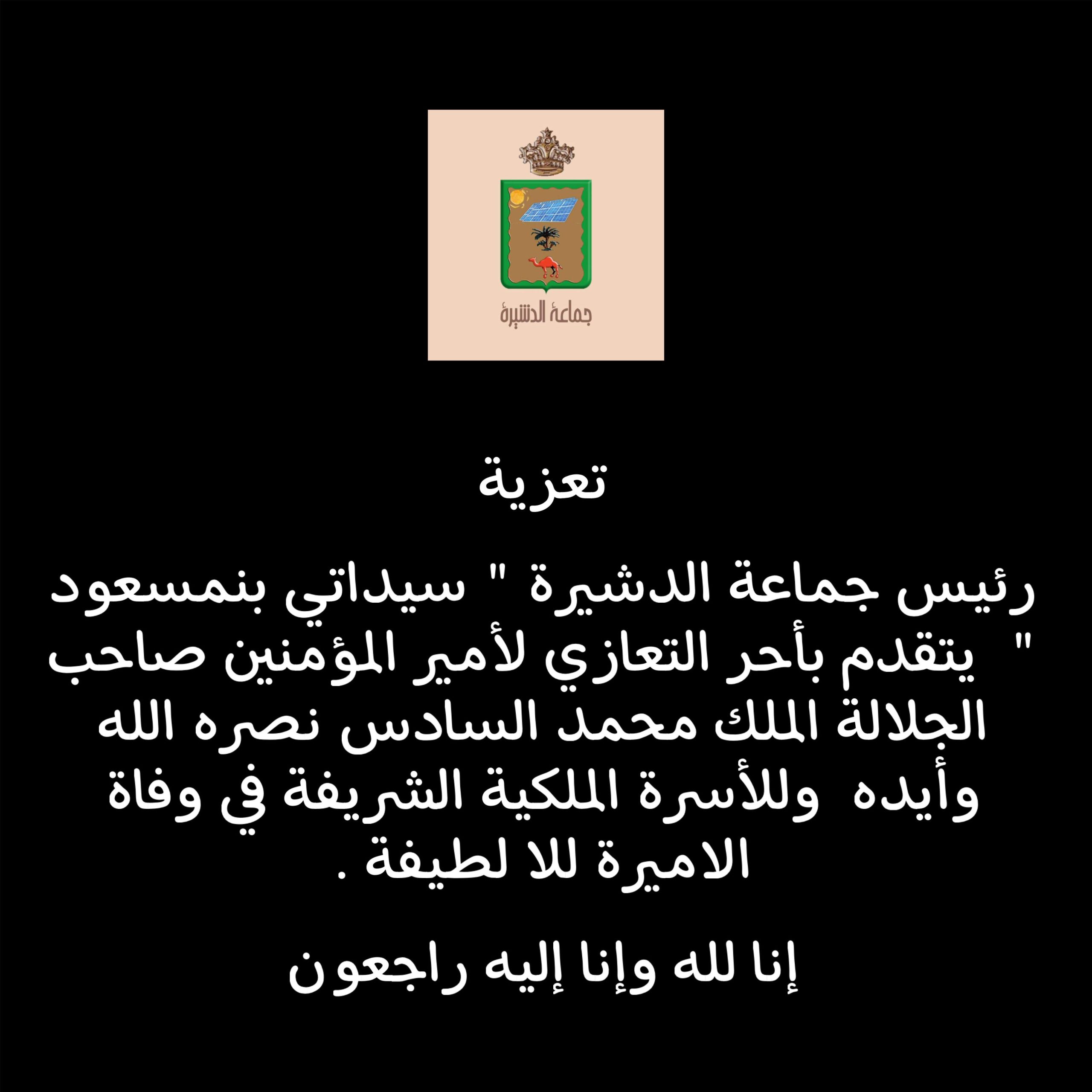 رئيس جماعة الدشيرة ” سيداتي بنمسعود ” يتقدم بأحر التعازي لأمير المؤمنين صاحب الجلالة الملك محمد السادس نصره الله وأيده وللأسرة الملكية الشريفة في وفاة الاميرة للا لطيفة .