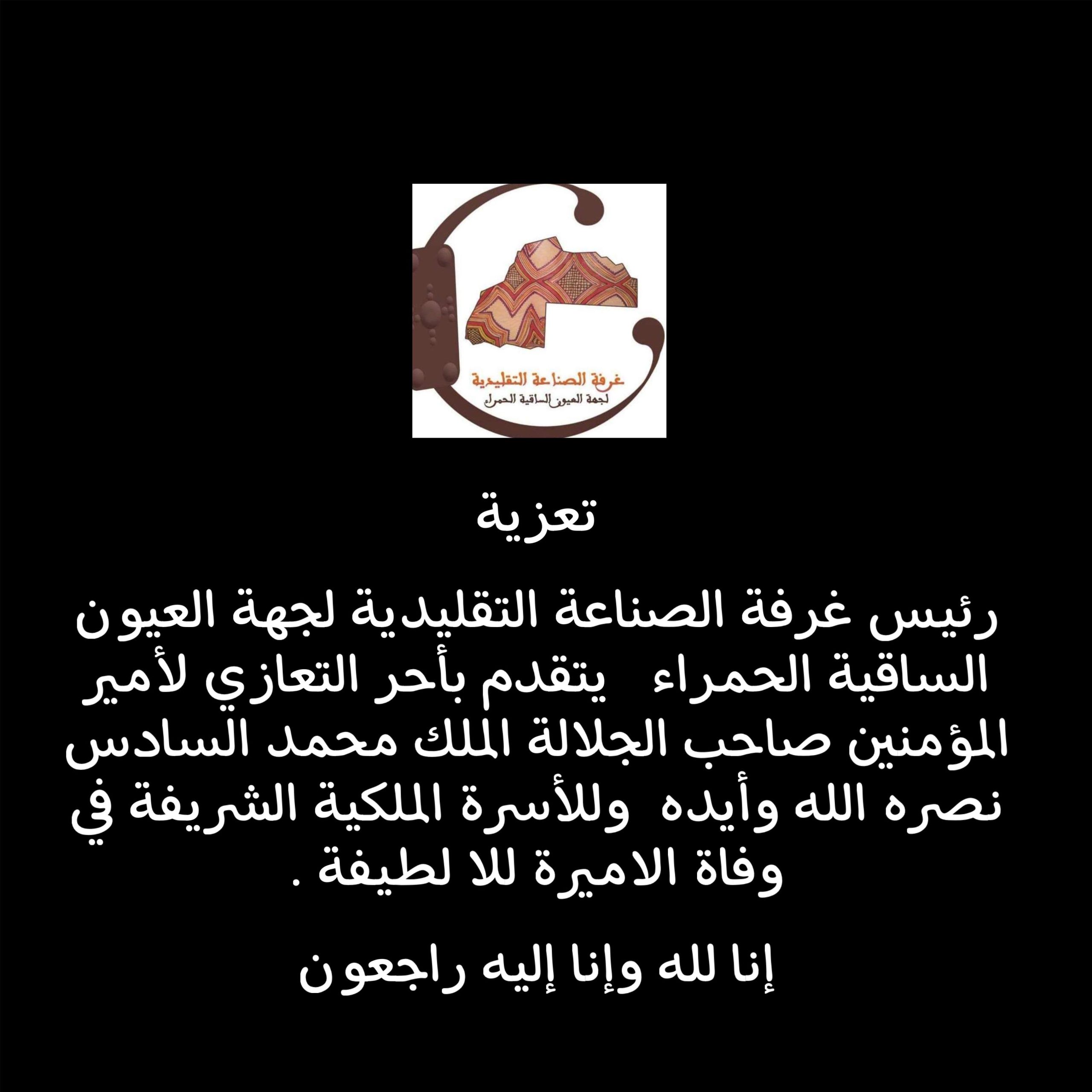 رئيس غرفة الصناعة التقليدية لجهة العيون الساقية الحمراء يتقدم بأحر التعازي لأمير المؤمنين صاحب الجلالة الملك محمد السادس نصره الله وأيده وللأسرة الملكية الشريفة في وفاة الاميرة للا لطيفة .