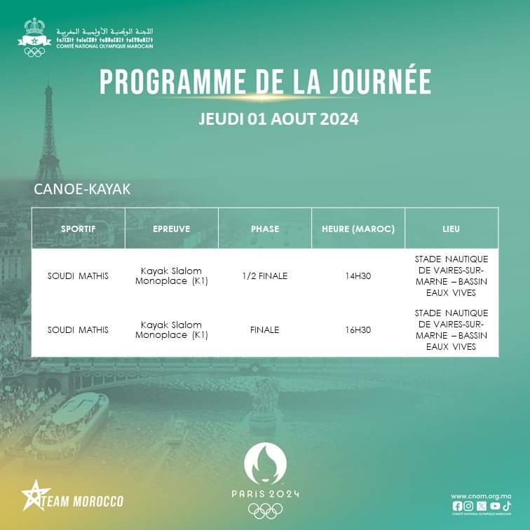 بدوره سيدخل البطل ” ماتيس سويدي” منافسات الدور ربع النهائي لمسابقة ” كانوي كاياك” إنطلاقا من الساعة الثانية والصف بالتوقيت المغربي .