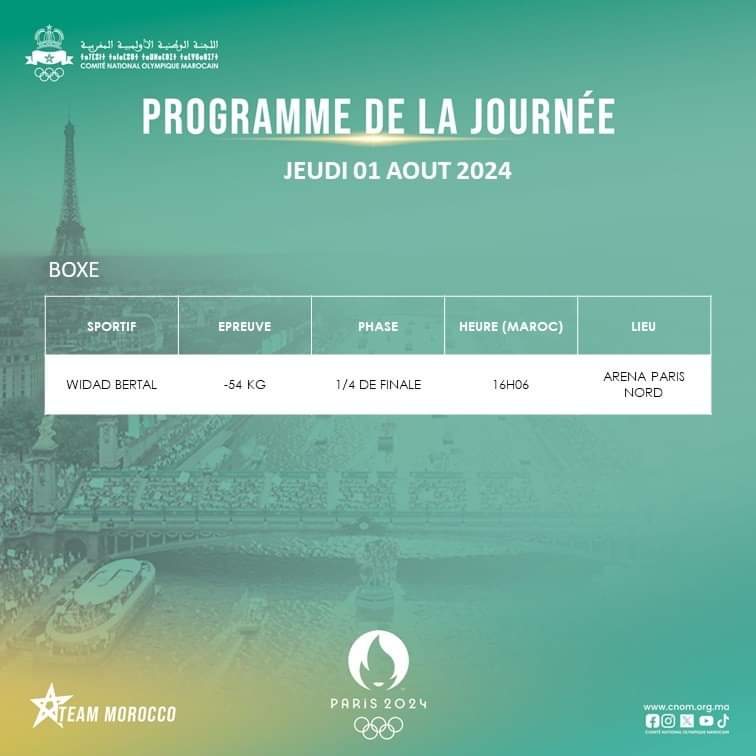 تتجهز البطلة المغربية و الملاكمة “وداد برطال” ، لخوض الدور ربع النهائي في دورة الألعاب الأولمبية “باريس 2024″، في وزن 54 كلغ.