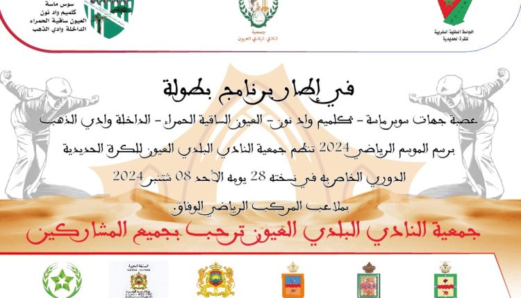 في إطار برنامج بطولة عصبة جهات سوس ماسة ، كلميم وادنون ، العيون الساقية الحمراء و الداخلة وادي الذهب ، برسم الموسم الرياضي 2024. تنظم “جمعية النادي البلدي للكرة
