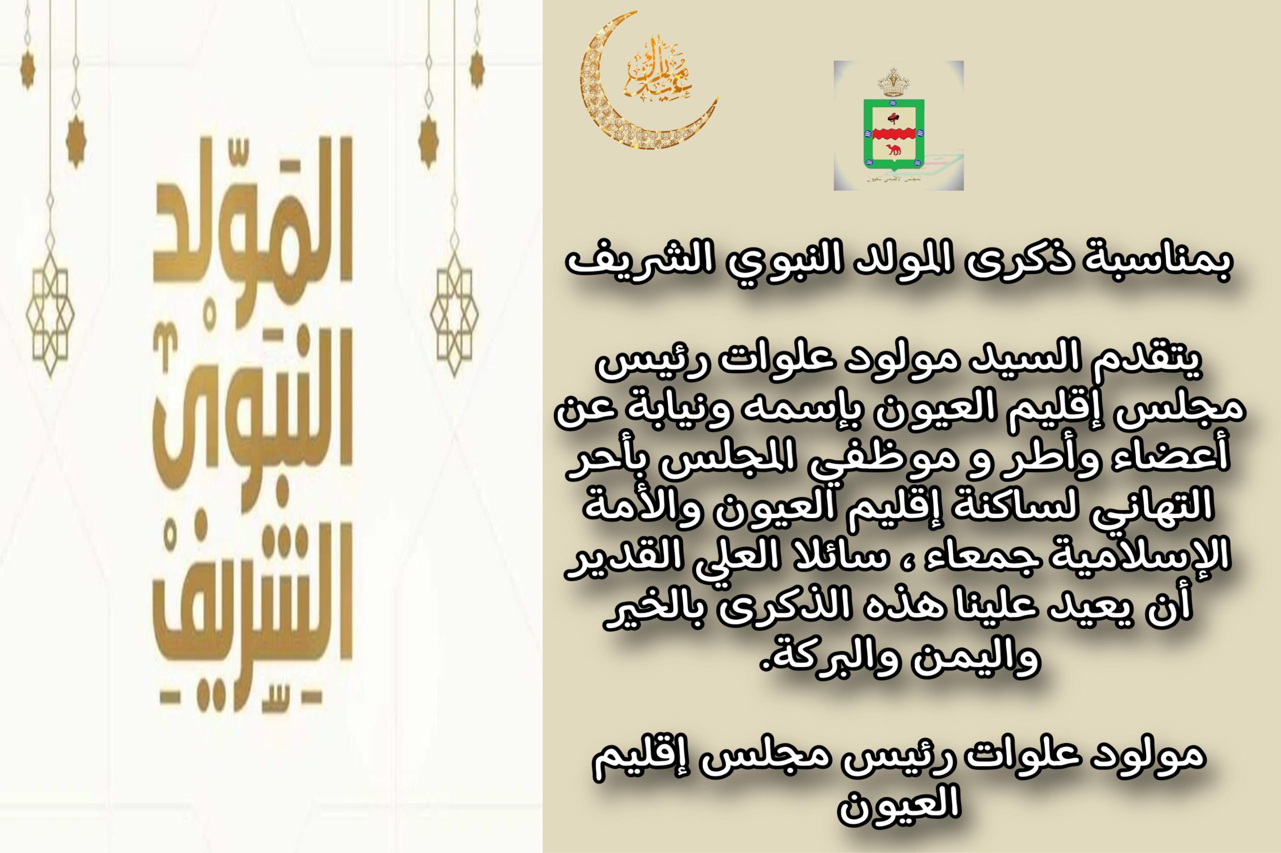 يتقدم السيد مولود علوات رئيس مجلس إقليم العيون بإسمه ونيابة عن أعضاء وأطر و موظفي المجلس بأحر التهاني لساكنة إقليم العيون والأمة الإسلامية جمعاء ، سائلا العلي القدير أن يعيد علينا هذه الذكرى بالخير واليمن والبركة.