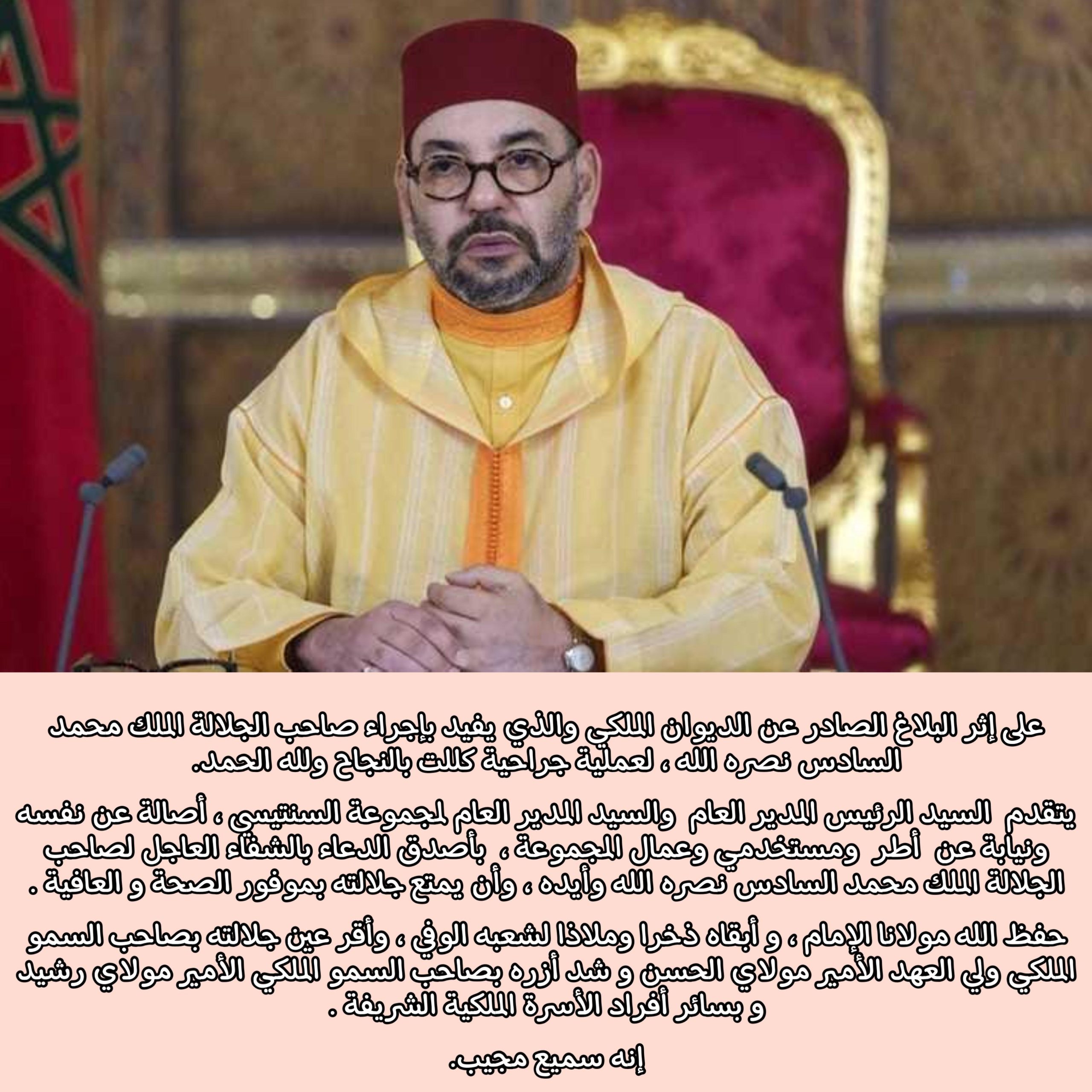 على إثر البلاغ الصادر عن الديوان الملكي والذي يفيد بإجراء صاحب الجلالة الملك محمد السادس نصره الله ، لعملية جراحية كللت بالنجاح ولله الحمد.