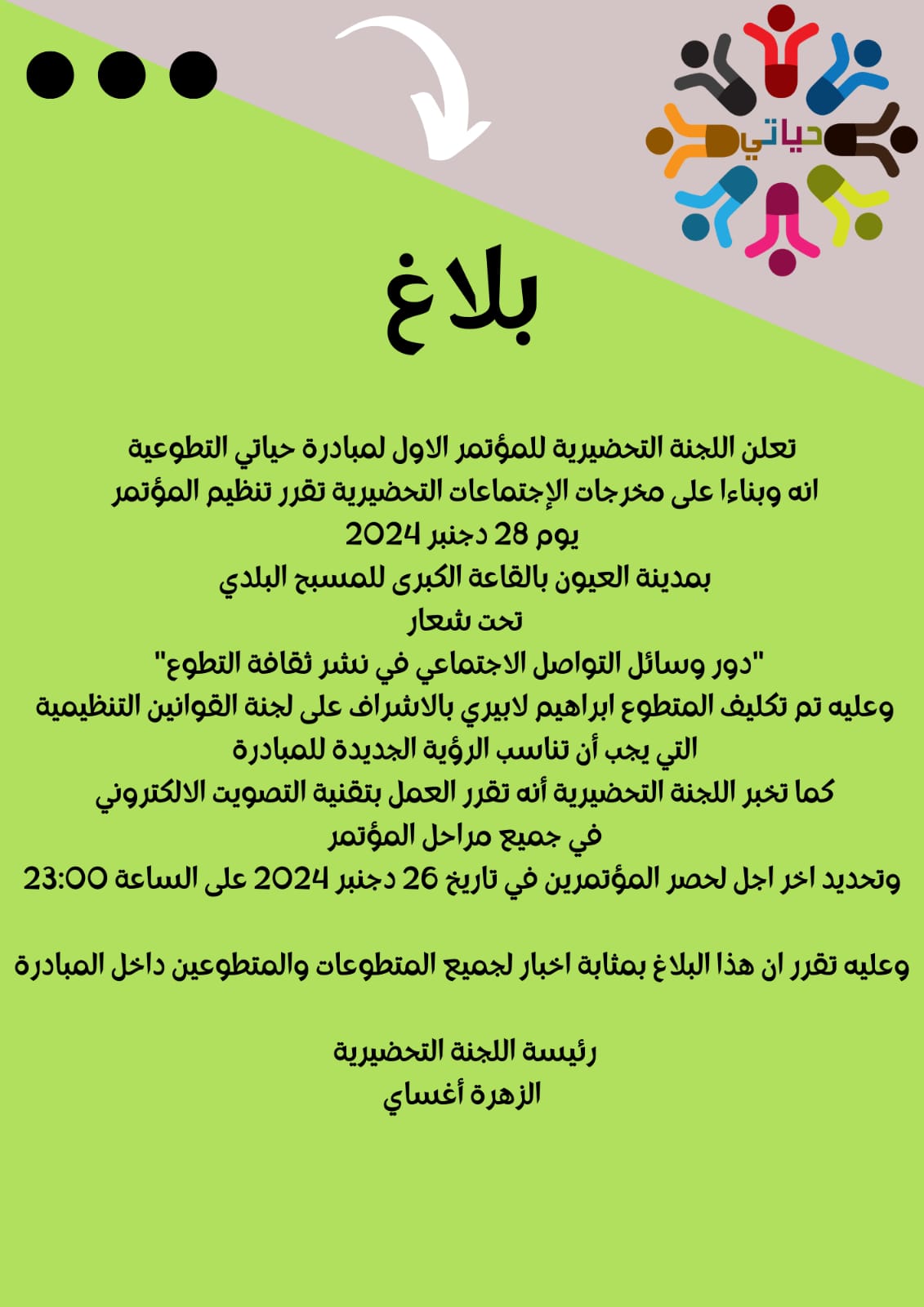 وتحديد اخر اجل لحصر المؤتمرين في تاريخ 26 دجنبر 2024 على الساعة 23:00 ، وعليه تقرر ان هذا البلاغ بمثابة اخبار لجميع المتطوعات والمتطوعين داخل المبادرة.