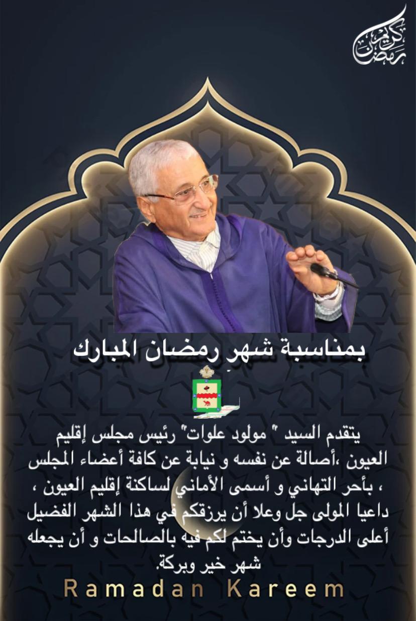 بمناسبة حلول شهر رمضان المبارك، يتقدم السيد مولود علوات رئيس المجلس الإقليمي للعيون بأحر التهاني إلى ساكنة إقليم العيون.