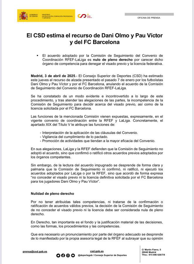 قرر المجلس الأعلى للرياضة (CSD)، اليوم الخميس، قبول الاستئناف الذي قدمه اللاعبان داني أولمو وباو فيكتور، إلى جانب نادي برشلونة، في 7 يناير الماضي، وإلغاء القرار الصادر عن لجنة متابعة اتفاقية التنسيق بين الاتحاد الإسباني لكرة القدم ورابطة الدوري الإسباني.