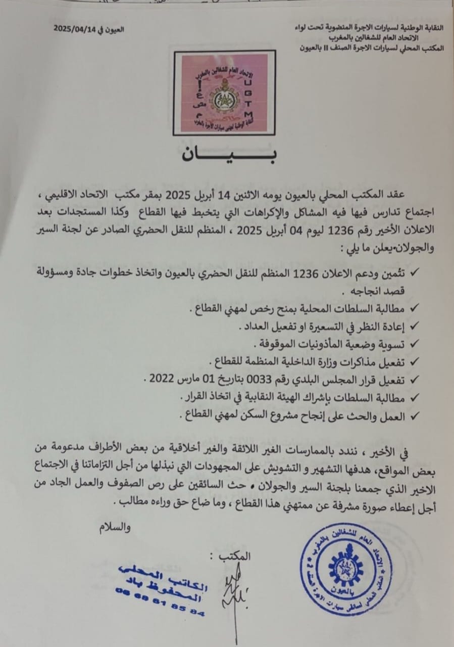 عقد المكتب المحلي لسيارات الأجرة المنضوي تحت لواء الاتحاد العام للشغالين بالمغرب اجتماعاً مهماً يوم الاثنين 14 أبريل 2025 بمقر مكتب الاتحاد الإقليمي بالعيون، خصص لتدارس التحديات التي تواجه القطاع، خاصة بعد صدور إعلان 1236 المنظم للنقل الحضري.