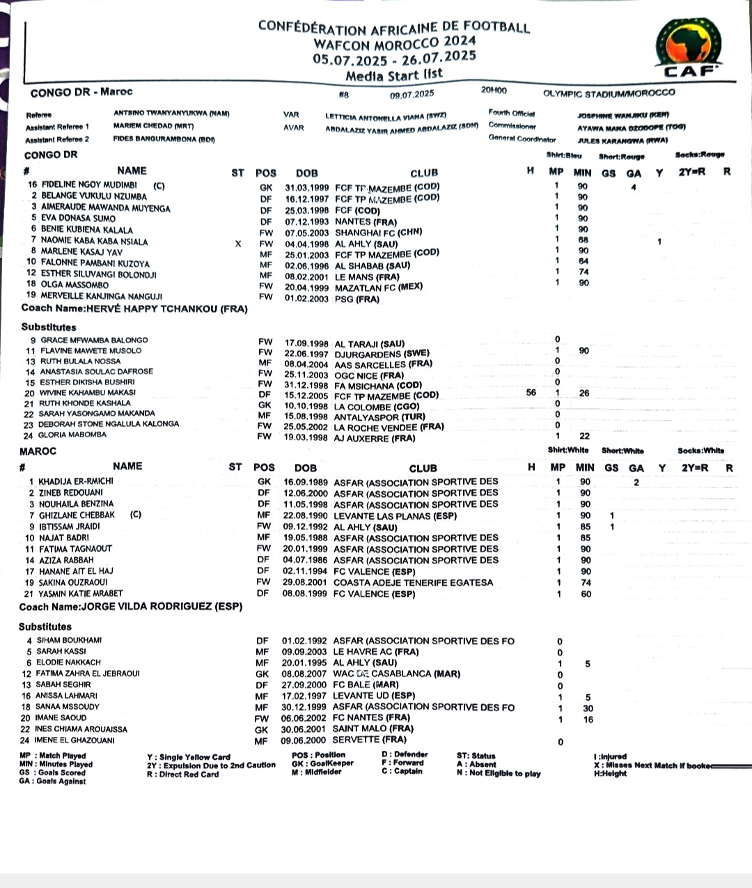 أعلن الناخب الوطني ” جورجي فيلدا رودريغيز” عن التشكيلة الرسمية للمنتخب الوطني المغربي ، التي ستواجه منتخب الكونغو الديمقراطية ، برسم الجولة الثانية لحساب المجموعة الاولى من نهائيات كاس إفريقيا لكرة القدم النسوية ( المغرب 2024).