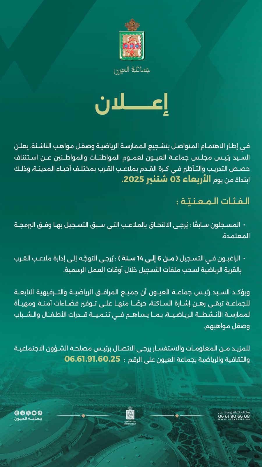 في إطار العناية المتواصلة بتشجيع الممارسة الرياضية وصقل مواهب الناشئة، أعلنت جماعة العيون عن استئناف حصص التدريب في كرة القدم بملاعب القرب المنتشرة بمختلف أحياء المدينة، وذلك ابتداء من يوم الأربعاء 3 شتنبر 2025، لفائدة مختلف الفئات العمرية.