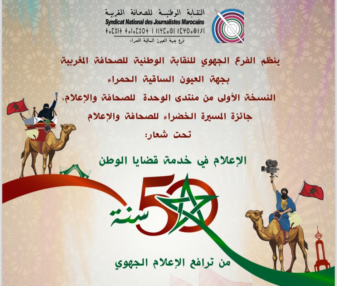 أعلن الفرع الجهوي للنقابة الوطنية للصحافة المغربية بجهة العيون الساقية الحمراء عن تنظيم النسخة الأولى من منتدى الوحدة للصحافة والإعلام، تحت شعار: “الإعلام في خدمة قضايا الوطن.. 50 سنة من ترافع الإعلام الجهوي”، وذلك خلال الفترة الممتدة من 1 إلى 5 دجنبر 2025.