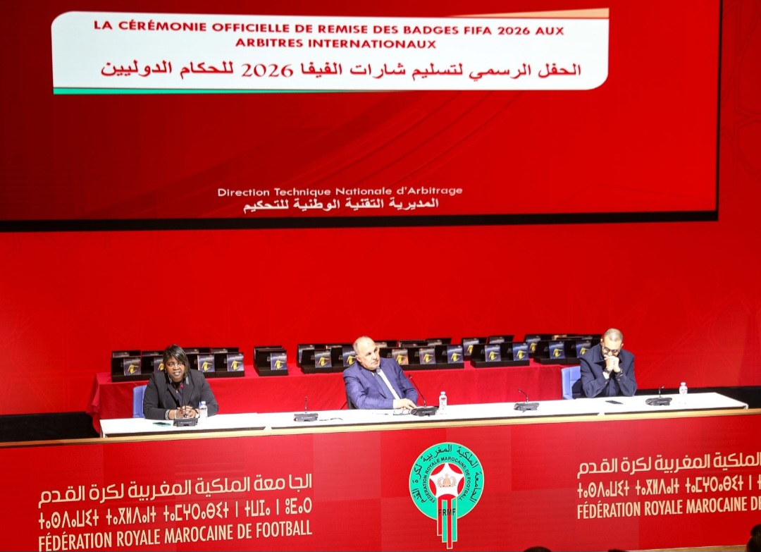 أشرفت السيدة خديجة إلا، عضو الجامعة الملكية المغربية لكرة القدم ورئيسة العصبة الوطنية لكرة القدم النسوية، أمس الأربعاء بمركب محمد السادس لكرة القدم بالمعمورة، على حفل تسليم الشارات الدولية الخاصة بسنة 2026 للحكام المغاربة، وذلك بعد اعتمادهم من قبل الاتحاد الدولي لكرة القدم “فيفا” ضمن اللائحة الدولية الجديدة. ويأتي هذا التتويج تأكيداً على المكانة التي بات يحظى بها التحكيم المغربي قارياً ودولياً.
