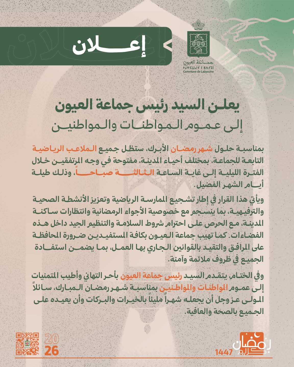 وأوضحت جماعة العيون في إعلان نشرته على موقعها الرسمي، أن هذا القرار يأتي في إطار تشجيع الممارسة الرياضية وتعزيز الأنشطة الصحية والترفيهية، بما ينسجم مع خصوصية الأجواء الرمضانية وانتظارات ساكنة المدينة، مع الحرص على احترام شروط السلامة والتنظيم الجيد داخل هذه الفضاءات.