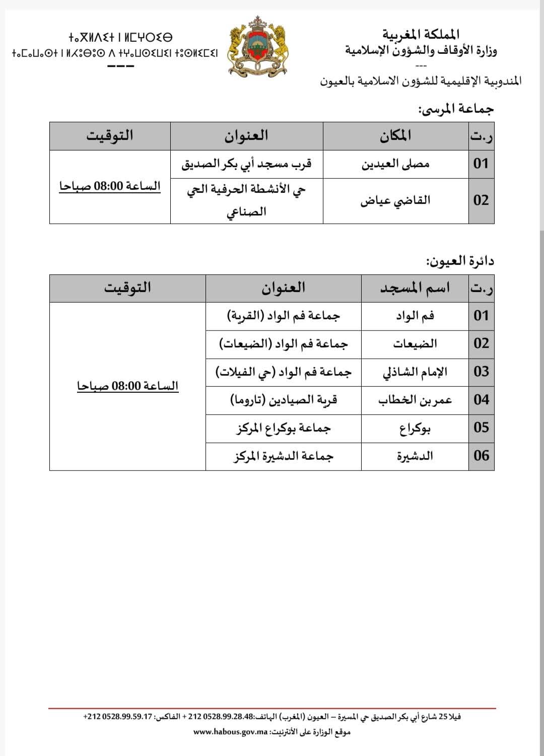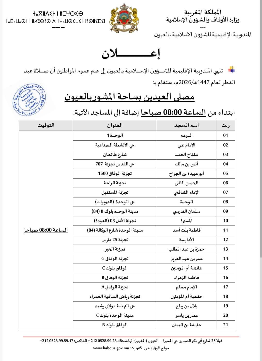 أعلنت المندوبية الإقليمية للشؤون الإسلامية بمدينة العيون، في بلاغ رسمي، عن الترتيبات الخاصة بإقامة صلاة عيد الفطر المبارك لعام 1447هـ الموافق لسنة 2026، حيث تقرر إقامتها على الساعة الثامنة صباحاً (08:00) بجميع المصليات والمساجد المعتمدة عبر تراب المدينة.