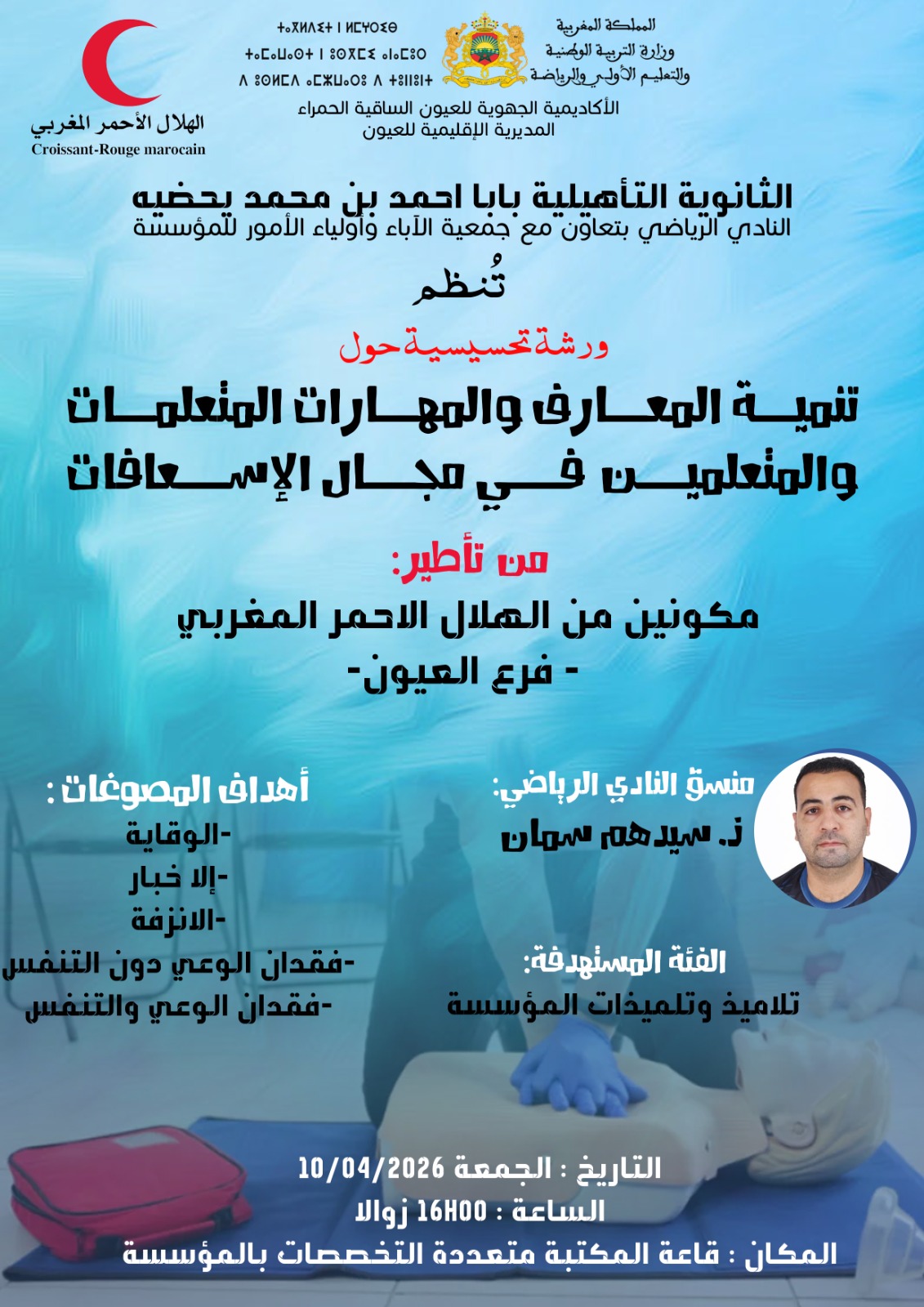 في إطار تعزيز الوعي الصحي لدى التلاميذ، نظمت إحدى المؤسسات التعليمية، يوم الجمعة 10 أبريل 2026، ورشة تحسيسية حول الإسعافات الأولية، احتضنتها قاعة المكتبة متعددة التخصصات بالمؤسسة، وذلك بتأطير من الهلال الأحمر المغربي – فرع العيون، لفائدة تلاميذ المؤسسة.