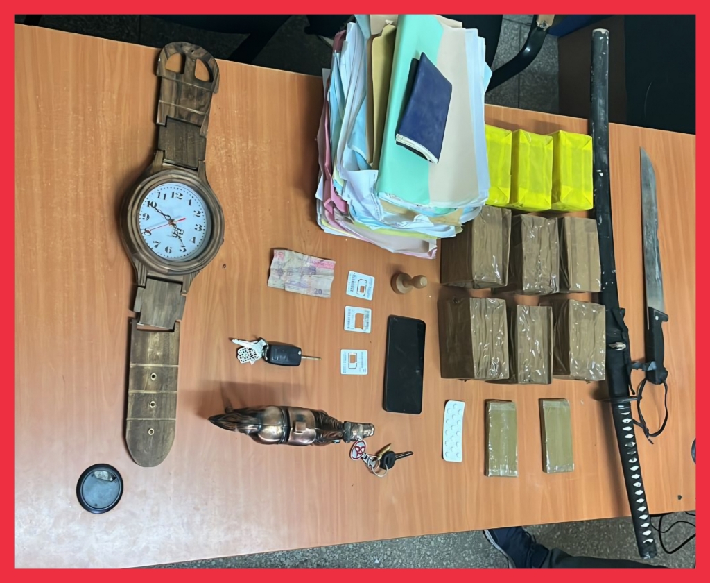 وقد جرى توقيف المشتبه فيه الرئيسي بمنطقة تقع بجماعة عوينة ايغمان التي تبعد بحوالي 120 كلم عن مدينة گلميم، بتنسيق مع عناصر الدرك الملكي المختصة ترابيا، كونه مبحوث عنه على الصعيد الوطني بموجب ثلاث مذكرات بحث. وتتعلق مذكرة البحث الأولى بإضرام النار عمدا بمكتب الغير والسرقة والضرب والجرح العمديين بالسلاح الأبيض، محاولة الاختطاف والتهديد لفائدة أمن گلميم، والثانية من أجل الضرب والجرح العمديين من طرف درك گلميم، فيما تتعلق الثالثة بالضرب والجرح العمديين بالسلاح الأبيض لفائدة أمن طانطان، كما أسفرت عملية التفتيش التي أجريت بداخل مسكنه عن حجز أربع كيلوغرامات ونصف من مخدر الشيرا، علاوة على15قرص مهلوس من نوع ريڤوتريل، فضلا عن حجز سيف وسكين كبيرين ومجموعة من الوثائق والديكورات المتحصلة من السرقة من داخل مكتب، كما تم حجز سيارة رباعية الدفع تحمل صفيحتي ترقيم مزورتين.