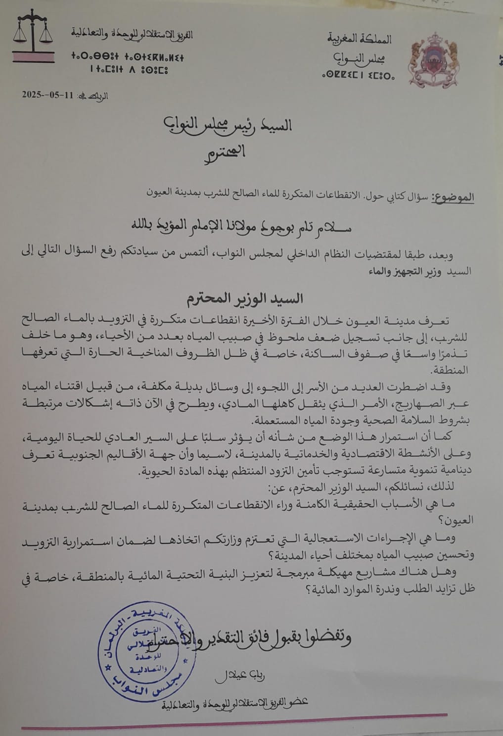 وجهت النائبة البرلمانية رباب عيلال، عن الفريق الاستقلالي للوحدة والتعادلية، سؤالاً كتابياً إلى وزير التجهيز والماء بشأن الانقطاعات المتكررة للماء الصالح للشرب بمدينة العيون، والتي أثارت استياءً واسعاً في صفوف الساكنة، خاصة في ظل ارتفاع درجات الحرارة وتزايد الطلب على هذه المادة الحيوية.