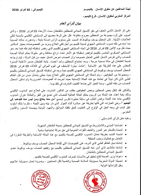 - إشادتنا بالتلاحم الذي أبان عنه التنسيق الميداني للمعطلين بكليميم مع رفيقهم المصاب يوسف بوكيوط عضو التنسيق الميداني للمعطلين بالطنطان .