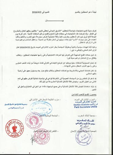و من هنا فان مناضلي و مناضلات التنسيق الميداني للمعطلين الصحراويين بكلميم يحمل جهاز الامن و و كافة المسؤولين مسؤولية سلامة الجسدية والصحية لرفيقنا و اننا سندخل في اشكال نضالية تصعيدية لن تخطر على بال احد حتى يتم اطلاق سراح رفيقنا و تحقيق مطالبنا المشروعة .