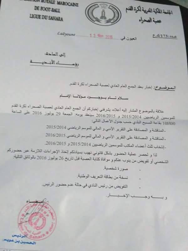 توصلت جديد الصحراء بمراسلة إخبارية تفيد بعقد عصبة الصحراء لكرة القدم لجمعها العام العادي للموسمين الرياضين 2014/2015 و 2015/2015 و ذلك يومه الجمعة 29 يوليوز 2016 بقاعة المسبح البلدي بالعيون .