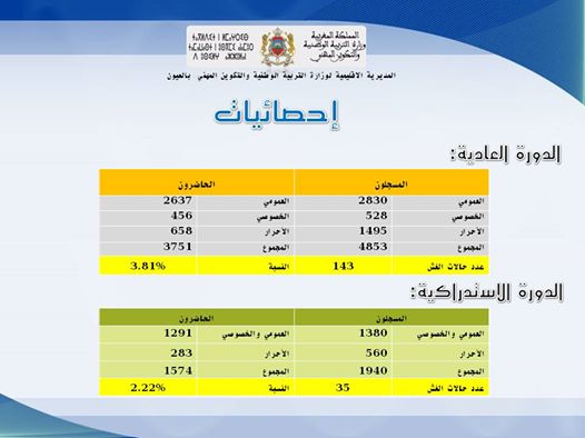وتجدر الإشارة إلى أن اختبارات الدورة العادية للامتحان الوطني الموحد لنيل شهادة البكالوريا برسم السنة الدراسية 2015-2016 عرفت حضور 3093 من المترشحين المتمدرسين بنسبة 85,67 % و658 من المترشحين الأحراربنسبة 44,01%، وقد تم تسجيل ما مجموعه 143 حالة غش، وهو ما يشكل نسبة 3,81% .