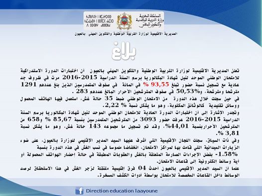 تعلن المديرية الإقليمية لوزارة التربية الوطنية والتكوين المهني بالعيون أن اختبارات الدورة الاستدراكية للامتحان الوطني الموحد لنيل شهادة البكالوريا برسم السنة الدراسية 2015-2016 مرت في ظروف جد عادية مع تسجيل نسبة حضور تبلغ 93,55 % في المائة في صفوف المتمدرسين الذين بلغ عددهم 1291 مترشحا ومترشحة، و%50,53 في صفوف المترشحين الأحرار البالغ عددهم 283 .