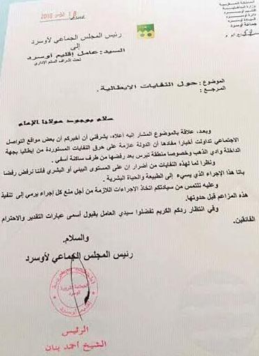 اقدم السيد الشيخ أحمد بنان رئيس المجلس الجماعي لأوسرد على مراسلة عامل الإقليم معبرا له عن رفضه التام لمثل هكذا قرارات مشيرا الى المخاطر البيئة المترتبة عنها و مدى خطورتها على صحة المواطنين بالمنطقة .