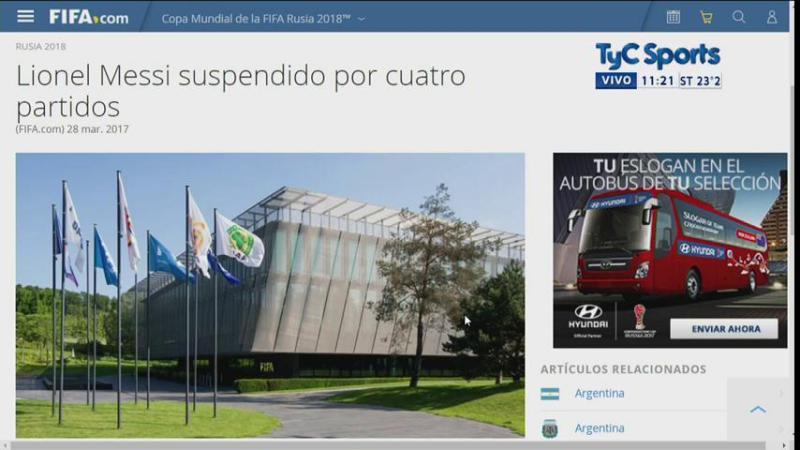 اعلنت اللجنة التاديبية في الفيفا عن ايقاف ميسي 4 مباريات مع منتخب الارجنتين في تصفيات كاس العالم، بسبب شتمه لحكم الراية في المباراة ضد تشيلي كما شوهد عبر لقطات الفيديو.