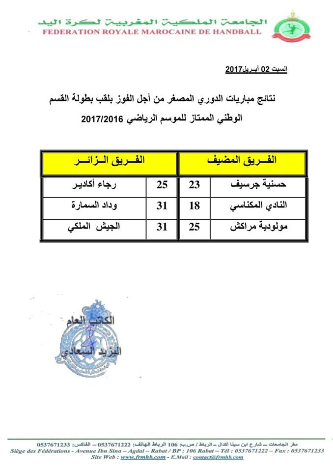 في إطار مباريات الدوري المصغر من أجل نيل لقب البطولة الوطنية لكرة اليد القسم الممتاز للموسم الرياضي 2016/2017 ، تمكن حامل اللقب فريق وداد السمارة من العودة بفوز كبير خارج الديار على مضيفه النادي المكناسي بنتيجة 31 مقابل 18 .