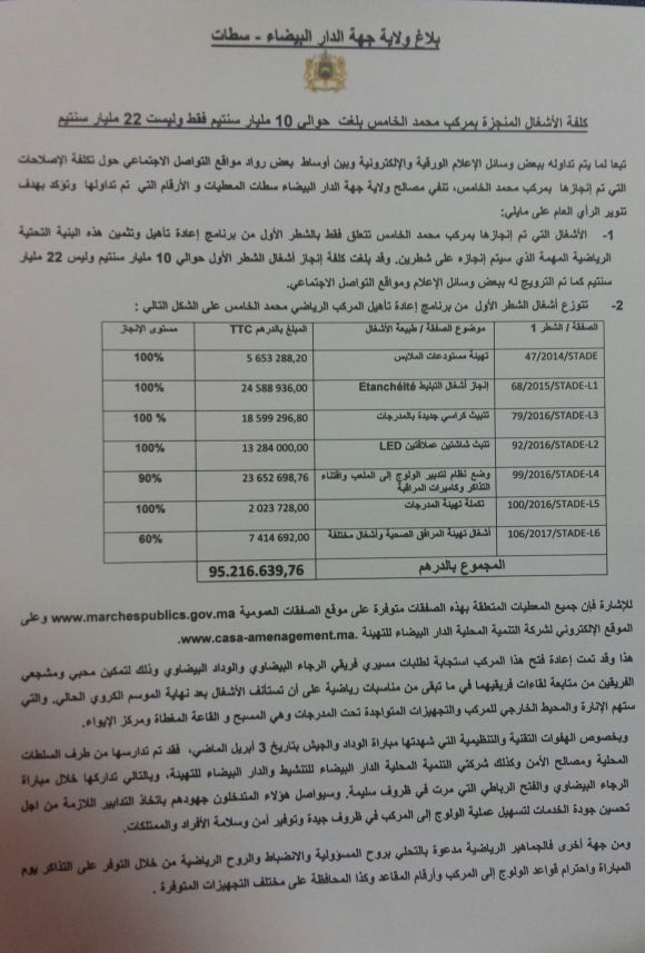 نشرت ولاية جهة الدارالبيضاء سطات بلاغاً توضيحياً توصلت به “البطولة” لإبراز كلفة الأشغال المنجزة بمركب محمد الخامس بالدارالبيضاء والتي بلغت 10 مليار سنتيم وليست 22 مليار سنتيم كما تم الترويج له.
