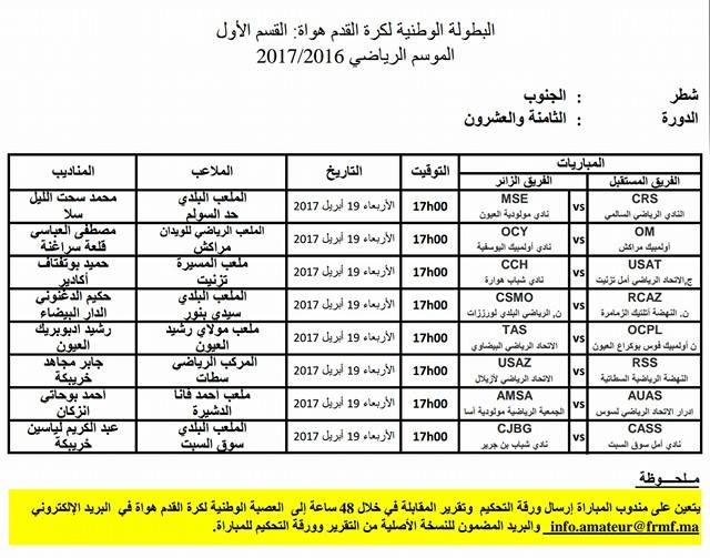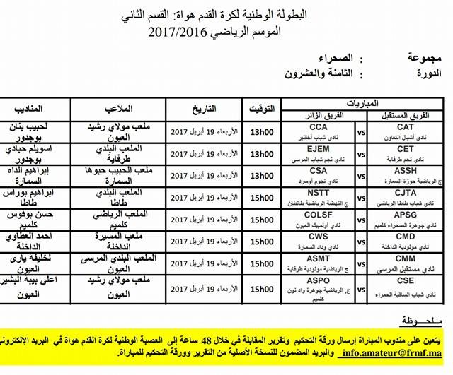 البرنامج الكامل للدورة 28 للقسمين الأول والثاني هواةسياسة إدارة الموقع نشر في 13 أبريل 2017 الساعة 6 و 53 دقيقة جديد الصحراء الرياضي : سعادو افنيدو مشاركة بفايسبوكFacebookFacebookمشاركة بتويترTwitterTwitter مشاركة بواتسابWhatsAppWhatsApp Share to ارسال ايميلEmailEmail مشاركة بلينكدانLinkedInLinkedInمشاركة بمسنجرMessengerMessenger طباعةPrintطباعة رابط المشاركة :